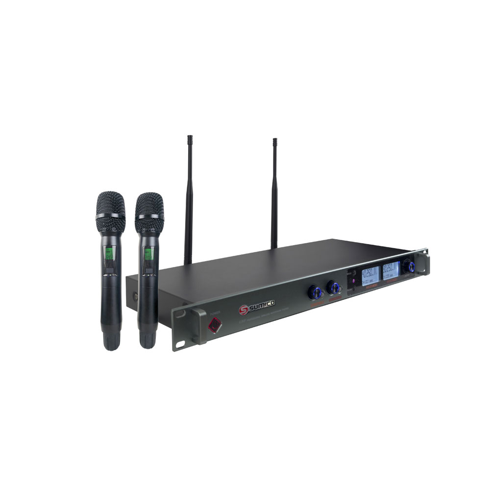 Sumico WMS2H là dòng micro không dây chuyên nghiệp 2 kênh, mang đến giải pháp âm thanh linh hoạt cho nhiều nhu cầu sử dụng từ gia đình đến sân khấu, sự kiện. Ngay từ thiết kế, micro Sumico WMS2H đã gây ấn tượng với phong cách hiện đại, sang trọng và hoàn thiện tỉ mỉ trong từng chi tiết. Phần đầu thu được chế tạo từ hợp kim cao cấp, mang lại độ bền cao và khả năng hoạt động ổn định trong thời gian dài. Mặt trước nổi bật với màn hình LCD hiển thị thông tin riêng biệt cho từng kênh, giúp người dùng dễ dàng theo dõi và điều chỉnh. Các nút vặn tinh chỉnh được bố trí khoa học hai bên màn hình, tích hợp đèn LED hỗ trợ thao tác nhanh ngay cả trong điều kiện ánh sáng yếu. Tay micro được làm từ hợp kim chắc chắn, phủ lớp sơn nhám chống trầy xước và hạn chế bám mồ hôi, tạo cảm giác cầm nắm thoải mái và chuyên nghiệp. Phần lưới chụp đầu micro bằng thép không gỉ có khả năng chống móp khi va đập, bên trong tích hợp lớp lọc âm giúp hạn chế tạp âm và bảo vệ củ micro khỏi hơi ẩm, nâng cao độ bền và chất lượng âm thanh. Ngoài ra, màn hình LCD nhỏ trên thân micro cho phép hiển thị tần số và tình trạng pin, giúp người dùng kiểm soát thiết bị dễ dàng hơn.